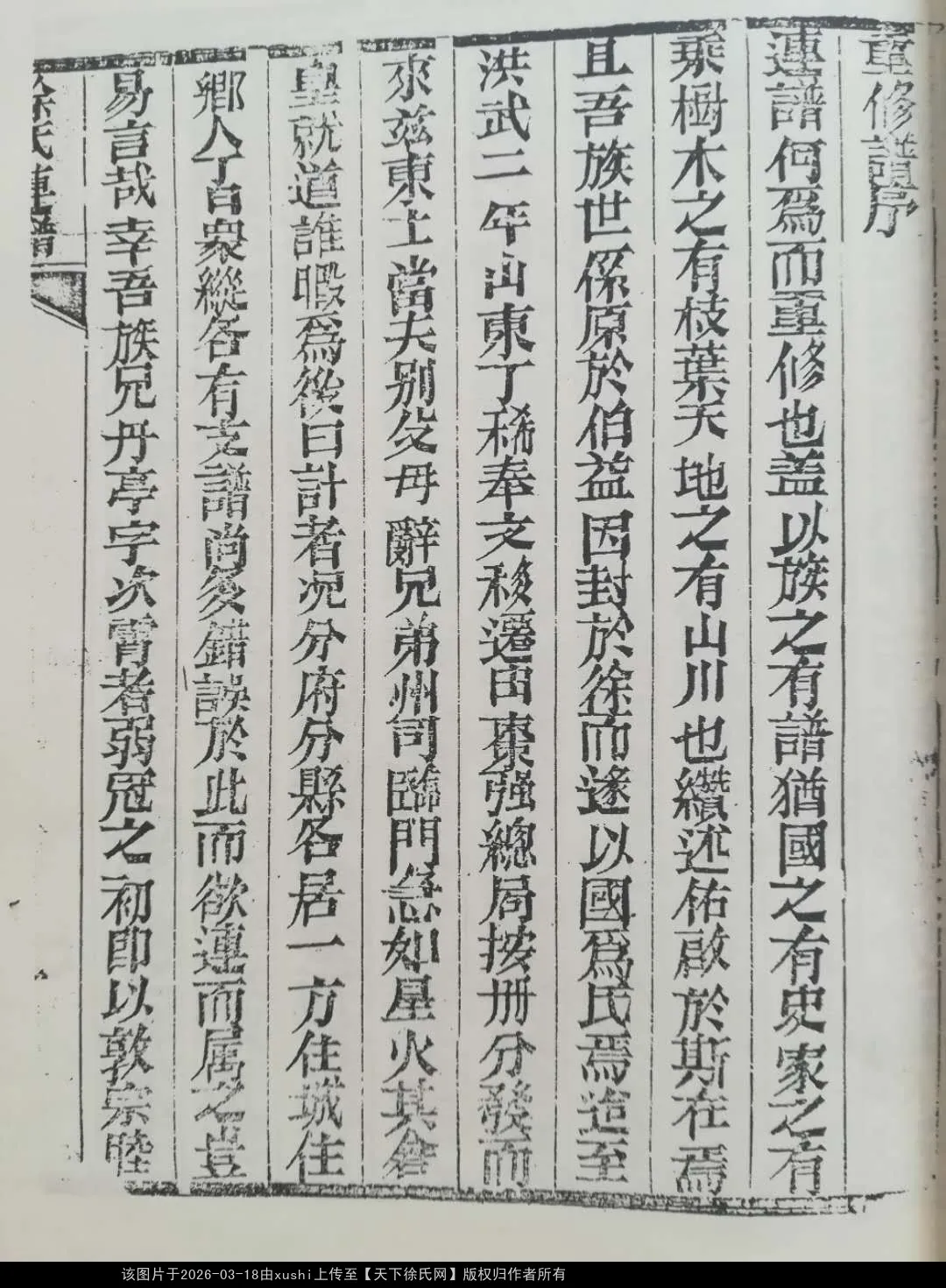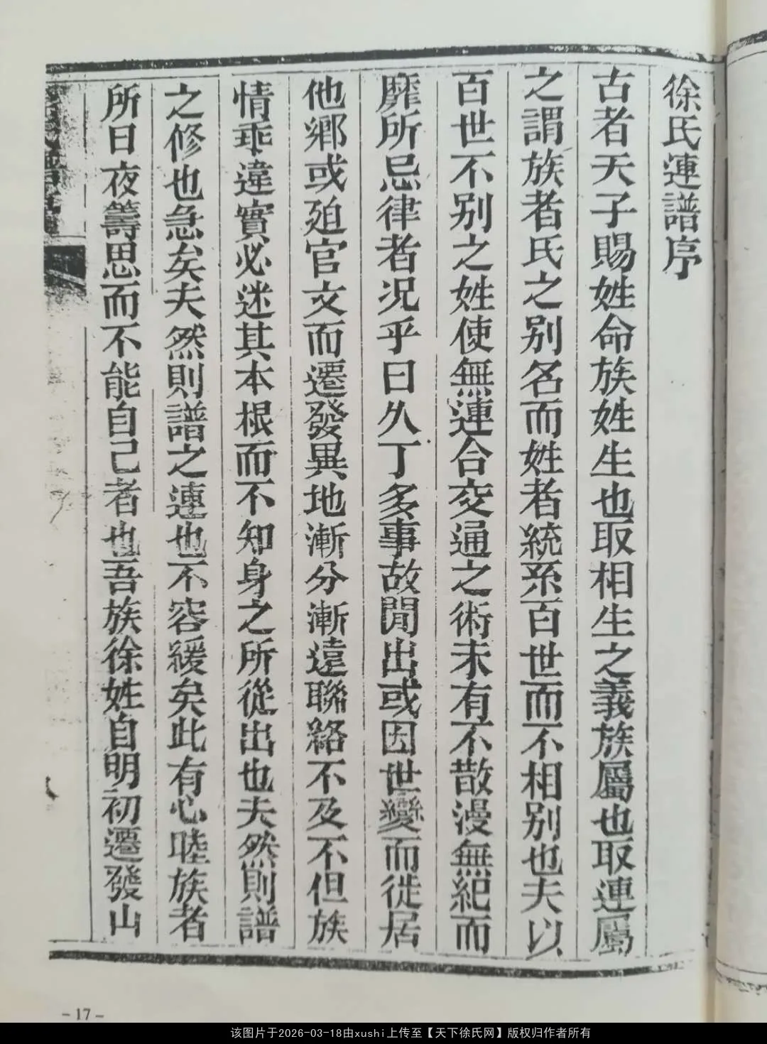 “生齿日众,族益盛而人益繁;或异乡作客,或京邸宦游,苟无谱系之,可寻机致相逢之莫识。此予欲修徐氏昆山籍谱,而有志未逮也”---永福徐公序言。