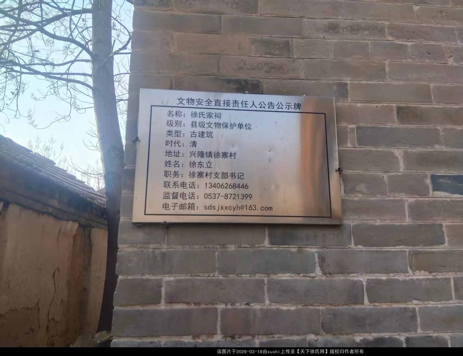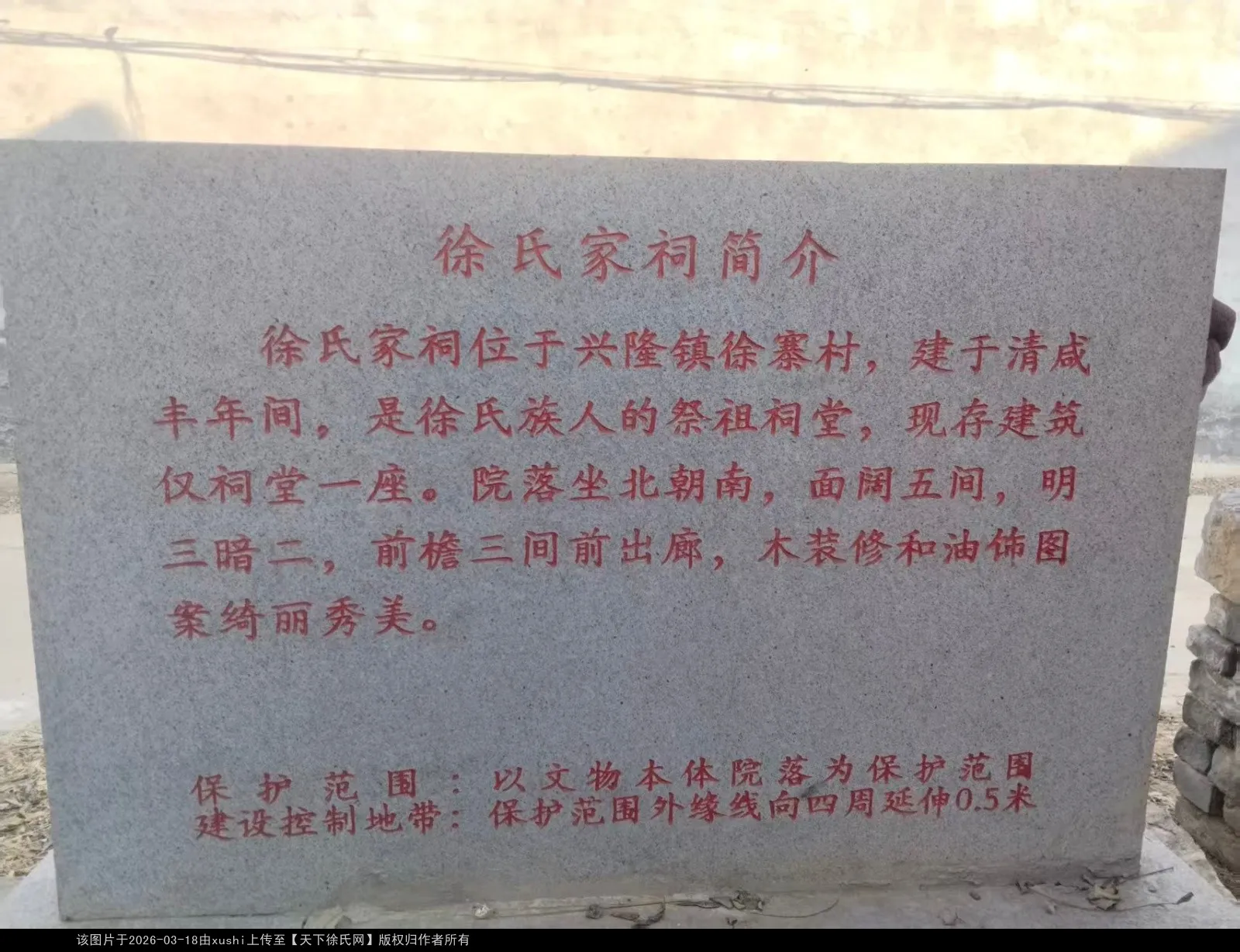时光流转,宗祠因年久失修,部分墙体已坍塌损毁,但整体骨架与前半部主体建筑仍完好保存,屋顶主结构依旧稳固,留存着修复的基础。2019年10月,金乡县人民政府公布徐寨村徐氏祠堂为县级文保单位。