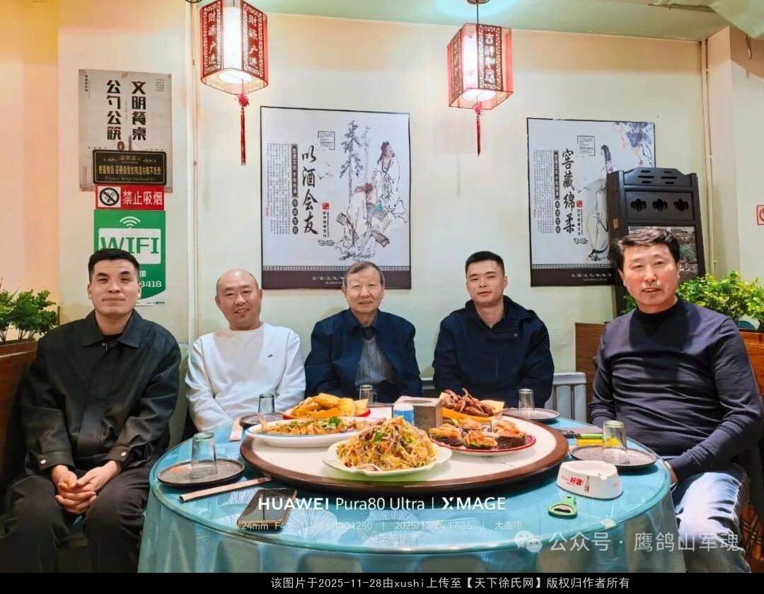 晚上致渤宗亲又安排了晚宴,参加晚宴的有徐向民、徐学彬。致渤宗亲举杯致辞,欢迎晓强和徐康宗亲来大连联谊,干杯!席间的主题是徐文化,包括徐国史、谱牒等。