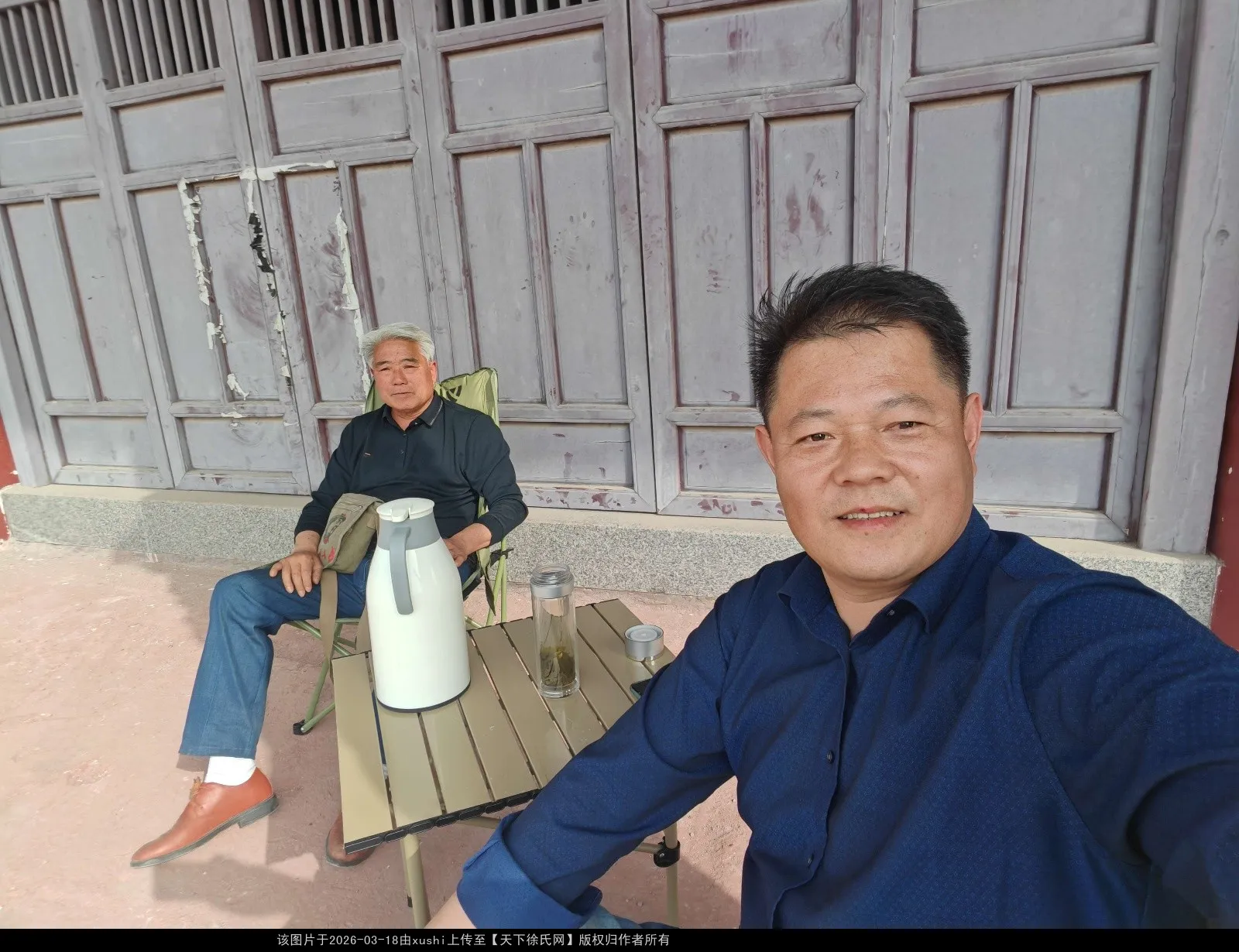 徐祉玺,徐文强在先祖大殿前正在商量大殿门窗维修加固施工方案。